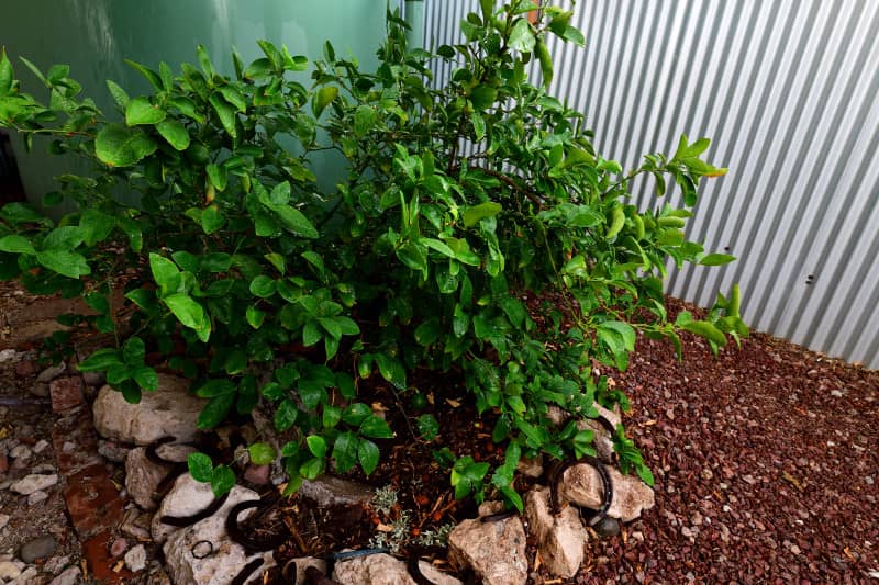 The Meyer lemon’s primary water source is greywater from the washing machine. But it will never refuse a drink from the Great Watering Can in the Sky.